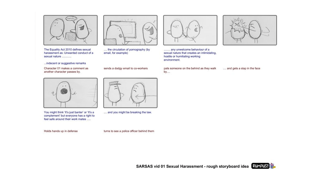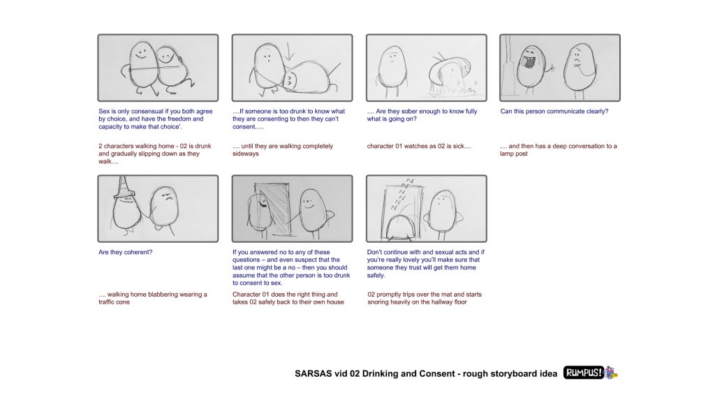 The client happily settled upon our silly ‘blobs’. They make mistakes and flounder around as the voice over gives advice on acceptable behaviours and common misconceptions around the themes.